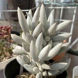 今日は日差しが眩しい☀️ 白い多肉の銀月 少しグレーがかって汚れているような?😓💦 扇風機の風が当たっていた所が 特にです ムムム● このpicの後ろが黒いジョww🏴☠️ 色白は七難隠すとか? 新芽早く伸びておいで〜❄️😊