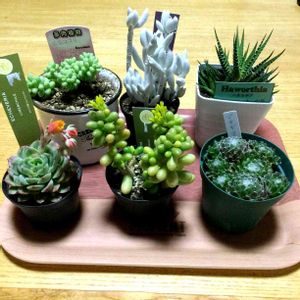 記録用 サボテン「アストロフィツム」 セダム「カメレオン錦」 セネキオ「銀月」 リプサリス「ピロカルバ」 サンセベリア サンセベリアは見切り品で100円でした。