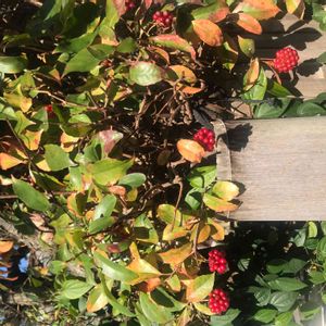 背高のっぽの豆柿の元には色々な植物が植えてあって 柊南天もあるんですけど。。。 この柊南天にビナンカズラが絡みつき 沢山の実をぶら下げています🔴🎶 奥にはモミジのベニシダレが紅葉していて見頃でしたよ🤗🍁