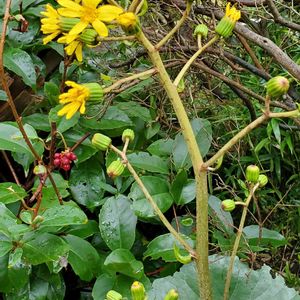 石蕗が咲き始めました。 後ろには美男葛の実も色づき始めました。