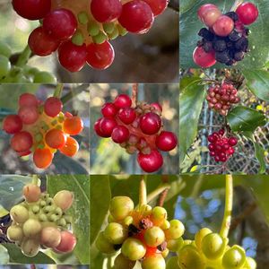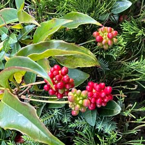 角の家🏠 片方の塀の上には写真の《実葛》サネカズラの実が、もう片方の塀の上には《郁子》ムベの実がなっていました💚いずれもつる性、雄花と雌花あり 真っ赤に色づく前の、粒の大きさも色も様々なとこが面白いなって思いました😊