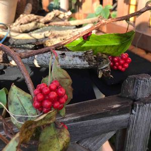 ビナンカズラ 美男葛 と書きます イケメン葛 ってとこでしょうか 昔はこの蔓から 整髪料を作ったので こんな名前になったそうです( ⁼̴̶̤̀ω⁼̴̶̤́ ) このビナンカズラは 実生から育てて庭のフェンスに這わしています 赤い実と なんとも侘び寂びのある 葉っぱの紅葉が 気に入っています