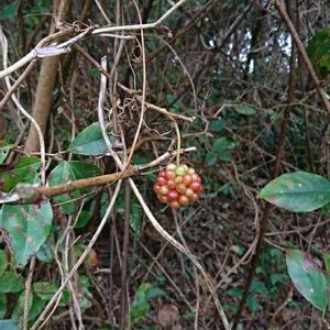 ビナンカズラ(美男葛)の実が赤く綺麗に実ってます 美男😅って調べたら、昔つるから粘液をとって整髪料にしてたらしいです サネカズラともいいます よそ様の敷地なので、観賞だけね😉