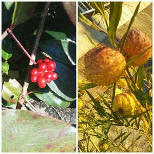 ツルウメモドキ、常山アジサイの紺色の実 右下はわかりません。 昔は男性の整髪剤にしてたとか