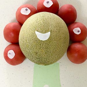 🍈メロンでカエルちゃんを作りました🐸 メロンアートですねー😄 20分で作って20分でたべました🍈 🍊ミカンアート🍌バナナアート 🍅カキアートも見てねー
