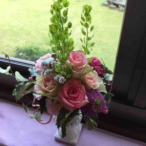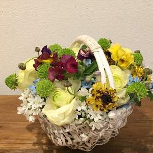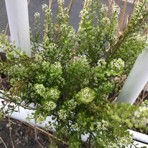 今日は気温が低めで、時折☔️… 庭仕事も出来ないので、先日バス停の側の歩道から採取して来た、グンバイナズナに庭に咲いている花たちでアレンジしてみた。