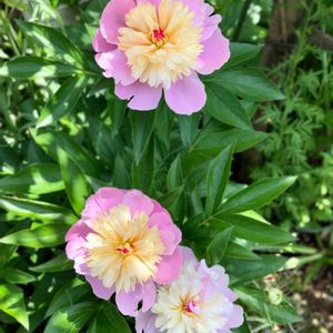 おはようございます😃 昨日の強風で折れてしまった花もありました😅 シャクヤクは、大丈夫です♡ 「ソルベット」 甘くて冷たいシャーベット 練乳がかかっているようね🩷😄 開花〜蕾へ