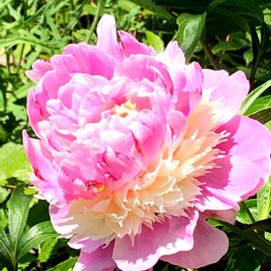 芍薬です。甘いいちごミルク色が美しい。思わずパチリ。日当たりがいい場所が、一番大きく咲いていました。 芍薬(シャクヤク)は、ボタン科ボタン属の多年草。香りが良く香水にも使われ、海外では、「5月に咲くバラ」と呼ばれています。 牡丹との違いは、牡丹より遅れて咲き、牡丹の花より小さいサイズ。 草木性の為、真っ直ぐ伸びた先に花が咲きます。蕾は球体で、葉は丸く細長い。厚みとツヤがあります。 咲き終わりは、椿みたいに花の頭ごと崩れる。地上部が枯れ根だけ残り、春に新芽が出ます。