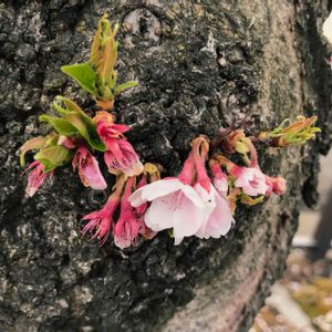 桜並木の内の1つが満開の懐で新しい芽と花を咲かせていて、植物の素晴らしい生命力を感じます