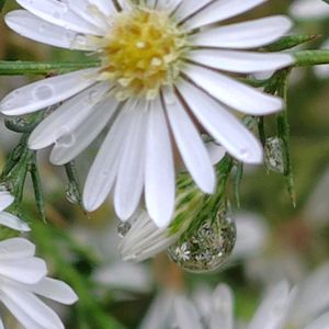 こんにちは 雨に濡れている孔雀草 奇跡的に雫の中にお花が反射して 写っています 秋の花 季節を感じますね