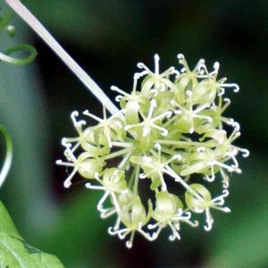 「シオデ(牛尾菜)」 花が終わったところ。雌花?雄花? アイヌの方言シュウオンテから来たものと言う。牛尾菜は漢名。若芽はアスパラの味がしておいしいとあった。 2020.7.5撮影