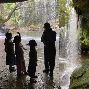 娘一家の熊本旅行🎵 阿蘇鍋ヶ滝💦 滝の裏側にいけて、、涼しそうです🌿 パパ爺ジと一緒に小5.3.1年生の孫娘は まだまだ熊本にいたいと、、🎵 昨夜、帰途に✈️