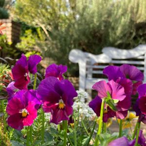 お気に入りベンチ🍃𓂃𓈒𓏸︎︎︎︎ あの白いベンチに腰かけて このお気に入りGarden🌸を 眺めるのが私の散歩コースの 一つ、ぼっ〜と出来る場所🤭 可愛いビオラさん… いつもありがとう♥️