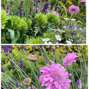 それぞれ🌸🤍💜🍃 お互いを引き立てあって 素敵な寄せ植え𓈒◌𓐍𓈒° ✿.スカビオサ ✿.テマリソウ ✿.ラベンダー ✿.カーペットカスミソウ どれも皆綺麗だね♪̊̈♪̆̈ 今日も笑顔で🍀*゜