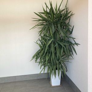 ユッカ エレファンティペス 一番の普及種だけあってめちゃくちゃ強健。 幹を宙に浮かせて根っこだけで支えた仕立てで放置して数年経ちますが生きています。その根っこもだいたい1~2年で枯れるので支えている根っこはほとんど死んでいます。 宙に浮いている幹の底から毎年1~2本の根っこを土に伸ばして水分補給をしています。 放置しているけど割とお気に入りだったりします。