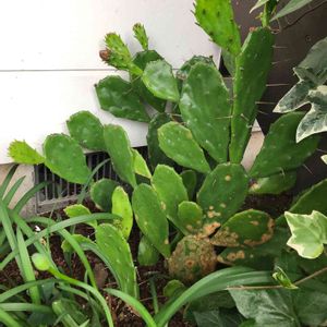リクエストにお応えして😊 ✨ウチワサボテン 地植え✨ 友人の庭から2〜3枚もらって 鉢で育てていましたが どこに置いても邪魔で💦 大きなトゲと目に見えないような小さなトゲも あり、あとから痛くなるのです💦 ただ強健な子で いくらでも増えます💪 いま気が付きましたが、花芽がありますね 黄色の大きな花が咲きます🌼