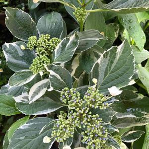 おはようございます☀ 前にご紹介した斑入りのアジサイです。 咲き始めました╰(*´︶`*)╯♡ 白のガクアジサイみたいです。 去年の春先に何本かご近所さんにもらって 挿したものです。 一年目にこんなに花を付けて 健気です🌸 葉っぱと花と 綺麗だなぁ!この子🥰