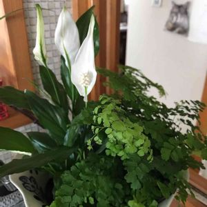 おはようございます☀ キッチンの花 ✨スパティフィラムとアジアンタム✨ カランコエを置いていましたが、花のあと 寂しいのでなにか新しいものをと探して いました。 調べると 両方とも直射日光は苦手で 水が好きで 霧を吹いてあげると良いと 同じ手当で良いようなので よかったです。 アジアンタムは小さい葉に惹かれて買ったものの うまく育てられなかった覚えがあります。 今回はがんばってみます🪴