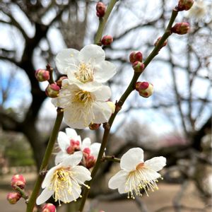 💠ハクバイ(白梅) シロカガ(白加賀)という品種です。 紅梅より白梅の香りのほうが好きです。 白加賀は肉厚の実を取るための実梅です。でも花も美しいので、全国の梅園に植えられています。 ⚫︎バラ科 サクラ属 ⚫︎原産 中国 ⚫︎花期 2月〜3月