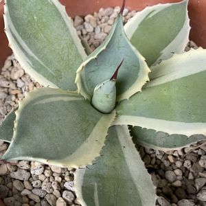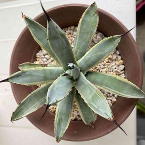 アガベ王妃雷神白中斑です🌵✨ 最近仲間入りしました😊 短葉で肉厚が良いですねーჱ̒ ー̀֊ー́ ) 成長が楽しみでーす😊