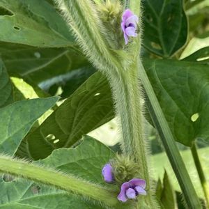 黒大吉 ダイズ 丹波の黒豆はお正月料理に欠かせない!⚫と私は思っているのだけれど、それを若い時期に収穫する丹波黒の枝豆🟢 大きく茂っている茎葉の陰で、ただいまひっそりと紫色の花が咲いております🟣 このまま落ちずに莢になってぷっくりと膨らむと良いのですが……もうちょっと雨が欲しいなー☔ 去年は大凶作(;>_<;) 今年も7月は少雨どころか、ほぼ1ヶ月雨が降らずに心配していましたが、営農組合の畑でもなんとか育っていて嬉しい♬ 竹の棒は、株が倒れないようにするための支柱です🟫 営農組合について……当地の場合ですが、専業農家ではない地域住民が共同で黒大豆とか稲などを育てています🌾 集落の農地の保全、つまり休耕田や廃棄田が増えないようにしつつ、みなさんに大地の恵みを味わっていただこう! という活動なので、夫の時給は年間平均300円でした🤣