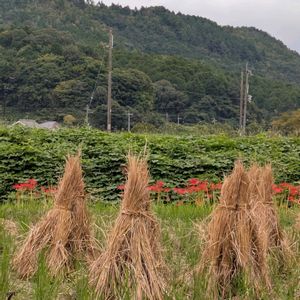 黒大吉 ダイズ 丹波の黒豆はお正月料理に欠かせない!⚫と私は思っているのだけれど、それを若い時期に収穫する丹波黒の枝豆🟢 大きく茂っている茎葉の陰で、ただいまひっそりと紫色の花が咲いております🟣 このまま落ちずに莢になってぷっくりと膨らむと良いのですが……もうちょっと雨が欲しいなー☔ 去年は大凶作(;>_<;) 今年も7月は少雨どころか、ほぼ1ヶ月雨が降らずに心配していましたが、営農組合の畑でもなんとか育っていて嬉しい♬ 竹の棒は、株が倒れないようにするための支柱です🟫 営農組合について……当地の場合ですが、専業農家ではない地域住民が共同で黒大豆とか稲などを育てています🌾 集落の農地の保全、つまり休耕田や廃棄田が増えないようにしつつ、みなさんに大地の恵みを味わっていただこう! という活動なので、夫の時給は年間平均300円でした🤣