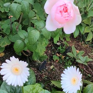 シャリファアスマ🌹と宿根ガーベラです💕💕 宿根ガーベラ、真夏も冬も咲いてくれるのですが、あっという間に大きな株になっちゃいます。