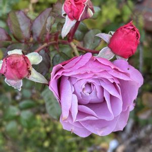 寒い朝です😰ゆっくりゆっくりお庭の薔薇達は開花中🌹 ①爽💜 ②ブルーバユー💜 ③センチメンタル❤️&マハネ🤍 ④ジュリア🤎 ⑤アンナプルナ🤍