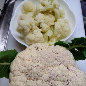 カリフラワー収穫😄 少し採り遅れぎみ💦 真っ白じゃぁない?!少し紫っぽい! 湯がいたら普通のカリフラワーでした。 何植えたんだろん〰️🤔