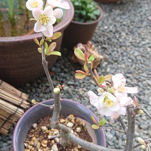 まだ咲き始めたばかりですが、今日のお花、ボケ(祝錦)。 昨年全くダメだったので、咲いてくれて嬉しいです😆 色がとても可愛い💗 ボケは色んな品種があって、どれも素敵ですよね🌸