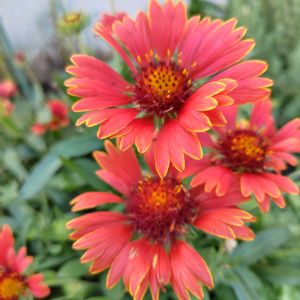 ①②ガイラルディア スピントップ キク科 和名テンニンギク 秋まで咲いてくれる宿根草🌿 暑い日でも元気で咲いてくれます🍥💕 ③ミニトマトピンキー 重そう😆 ④プリプリ!新鮮🍅😋 🏷️真っ赤な火曜日 に参加します 今日も猛暑の予報☀☀