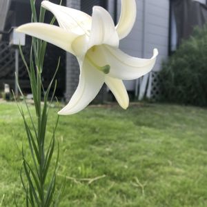 芝生の中のタカサゴユリ 芝刈りする度にジャマだなぁと思うのですが、じっくり観ると清楚で美しい