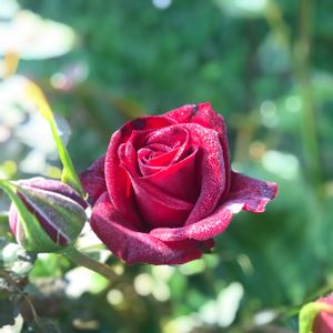 ニコロ・パガニーニ 朝露に濡れながら開花 メイアン作出 鮮やかな紅色で剣弁高芯咲き 微香 19世紀のバイオリニストに因んだ花名 アンクルウォルターの子孫 強健