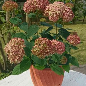 その昔…ガーデニングエンザにかかっていた頃。素敵なお庭のブロガーさんがアップする最新の花が欲しくて欲しくてたまらなかった時期がある。 …がしかし、田舎にはなかった。 🌿 🌿 🌿 その頃欲しかったピンクアナベルが、久しぶりに行った園芸店にあった…。 あの頃の鼻息の荒さはないけれど育てたいと思った(*^-^*)。花が終わったら地植えにしてください…らしいので、プラ鉢ごとテラコッタにちょい置き。