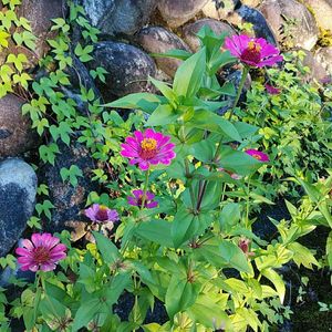 山あいの民家近く、 こぼれ種で育ったらしきヒャクニチソウが、道端を彩っていました(^-^) ヒャクニチソウといえば、わたしは、お盆に供える花 というイメージです(^_^) 咲き進むにつれて、花びらの色が、だんだん、褪めていく感じが、あまり、好きではなかったですが、道端に咲くヒャクニチソウを見て、色褪せも、いいや~(´^ω^)と思えました。