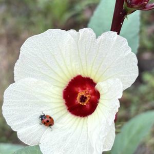 溢れ種からのローゼルに可愛いお客様が💕ブルーの可愛い宿根草カリオプテリスダークナイト(カリガネソウ)ベンケイソウのピンクの花が咲きました♪ 風船カズラがまだまだ実付けています☺️