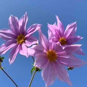秋の空 見上げる背高のっぽの皇帝ダリア 青とピンクの濃淡爽やかな色🎶