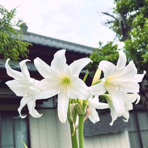 8月23日今日のお花.。*・゚゚ 💟ハマユウ(浜木綿)💟 💠アフリカハマユウ💠でした😅 ヒガンハナ科・ハマオモト属 アフリカハマユウは花柄(茎)が長く、インドハマユウにはほとんど無いそうです❗ ユリの花に似た大きなラッパ状の 白い綺麗な花 もう少し、花びらの細い「ハマユウ」とは違う けど素敵でした✨✨💓 ご近所散歩🚶♀️🎵6月撮影🤳 花言葉💐 『どこか遠くへ』『あなたを信じます』 『汚れがない』白い清楚な花姿からかな~♥ 花言葉は一緒でした😅