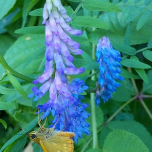 クサフジと思われます 散歩道となっている山裾の林縁に 青紫も鮮やかに咲いているのを見つけました 撮影している合間に ヒメキマダラセセリが蜜を吸いにやって来て 花から離れようとしませんでした
