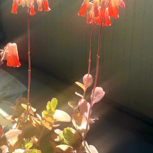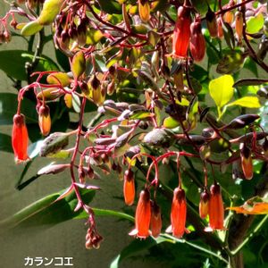 カランコエ・テッサ💠 ベンケイソウ科 花言葉 「人気」「人望」 枝先にオレンジ色のベル型 花が揺れてます♪︎♪︎♪︎♡ 昨年花後半分カット😃✂️✨しました漸くお見せする事が出来ました💖😊 シャンデリアの様です😉 毎日ベランダから小さなビニールハウスに移動☺️ 寒さよけ頑張ってます🤩