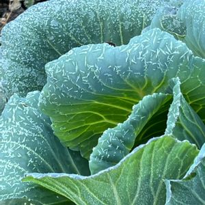 我が家の野菜畑のキャベツがバリバリの霜模様 野菜というより、霜の成せる芸術作品ですね! 花畑の霜柱もマイナス2℃で、氷の花の様です