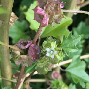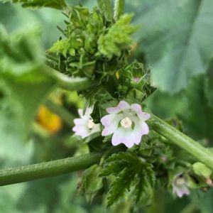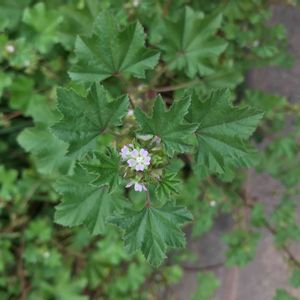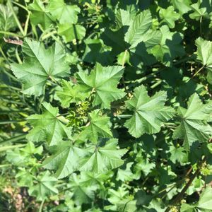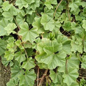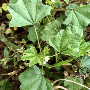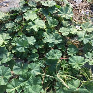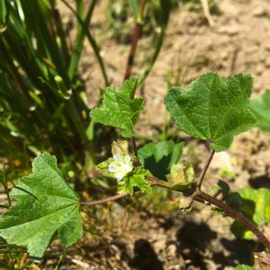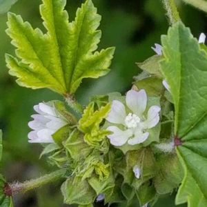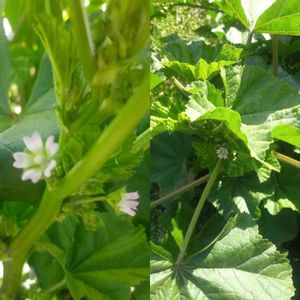 【ウサギアオイ】Malva parviflora アオイ科ゼニアオイ属 長い葉柄で互生。 6月から9月に花弁が5枚の白い小さな花を咲かせる。