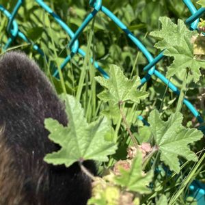 いつ来ても花が見られない兎葵 犬3匹ともおいしい草を見つけたようで鼻つっこんでる