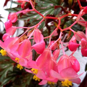 お花と黒葉の調和が美しい鉢花 木立性ベコニア 葉の間からいくつも垂れ下がってお花が咲き美しい