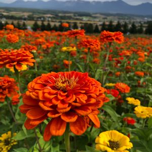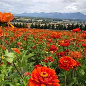 💠 今日のお花・ヒャクニチソウ 💠 10万㎡の花畑越に望む 富良野盆地と十勝連峰の大パノラマ *煙を上げている十勝岳です⛰️✨ ( 2022.9/16 『フラワーランドかみふらの』にて )