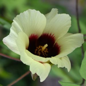 今日のお花、ワタ🌸🌿 こちらは、日本古来の伯州茶綿(和綿)のお花😊 オーガニックコットンで、おくるみを作ったら、さぞかし気持ち良いでしょう🚼 中心にエンジの目のある美しいお花でした😊 アオイ科なので、ハイビスカスにも似てますね🌺😃