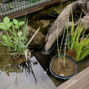 ⚠️よ〜く見ちゃうとカメちゃん(日本石亀)いますよ(笑) プラ舟ビオトープの植物達もだいぶ成長してきました!緑溢れる水辺っぽいのが良いですね〜♪ ②朝日を待ってるカメちゃん (*´ω`*)