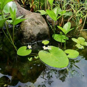 雨上がりのビオトープ♪ (*´ω`*) ①八重オモダカ②タコノアシ③ハスの果托④温帯スイレン「サイアムビューティー」⑤⚠️ツチガエル