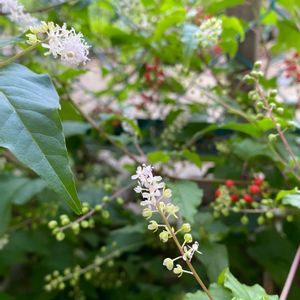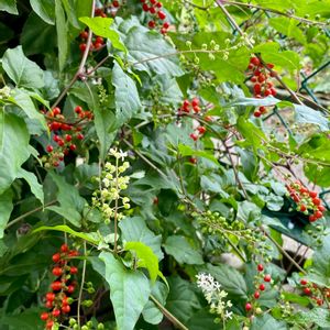 庭の一画に、こぼれ種からの数珠珊瑚(ジュズサンゴ)が白い花を咲かせ、赤い実をつけています。 秋の終わり頃まで、楽しませてくれます❣️