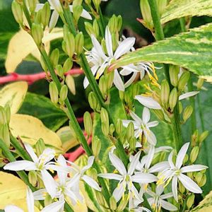 🌿☆アンテリクム(Anthericum)☆🌿 アスパラガス科アンテリクム属の多年生植物 西洋岩南天の隙間から星形の真っ白なお花が、遠慮がちに咲いてました(☆∀☆)🌿 いろいろ調べて🔍️👓️この名前じゃないかと思います(^^;
